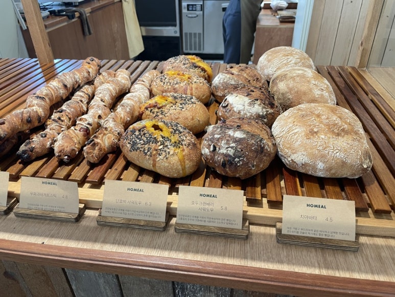 빵 종류로는 동그란 빵, 꼬불꼬불한 롤빵, 그리고 다양한 속재료가 들어간 패스트리들도 많이 있어요. 가격은 대체로 3,000원에서 5,000원 사이로, 합리적인 가격대에서 품질 좋은 빵을 맛볼 수 있어서 정말 좋더라구요.