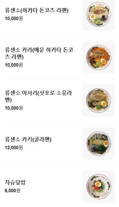 류센소의 메뉴는 다양하고 가격도 합리적이에요. 기본적으로 제공되는 라멘은 다음과 같아요: